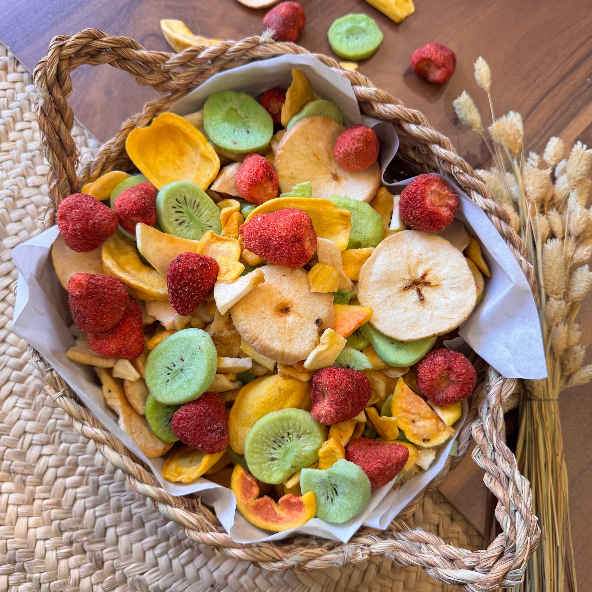 ميكس الفواكه الاستوائية المقرمشة يحتوي على ( الفراولة - التفاح - الموز - الخوخ - البابايا - الكيوي - الجاك فروتس )